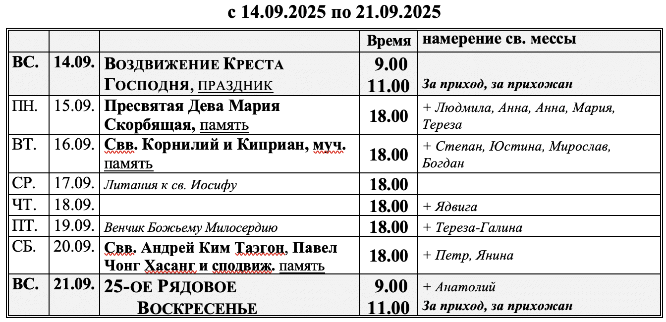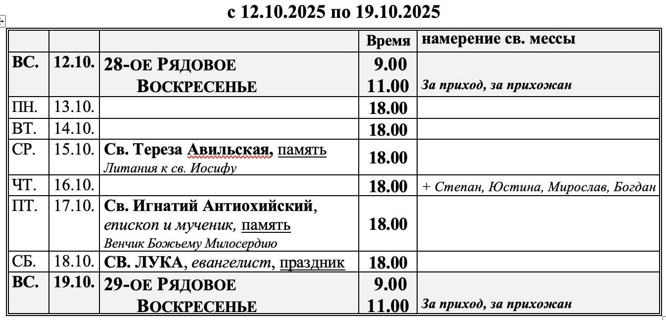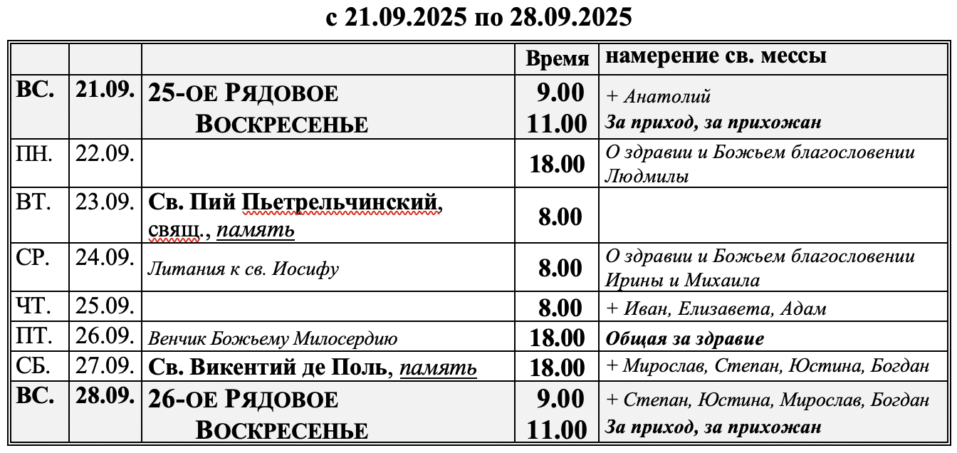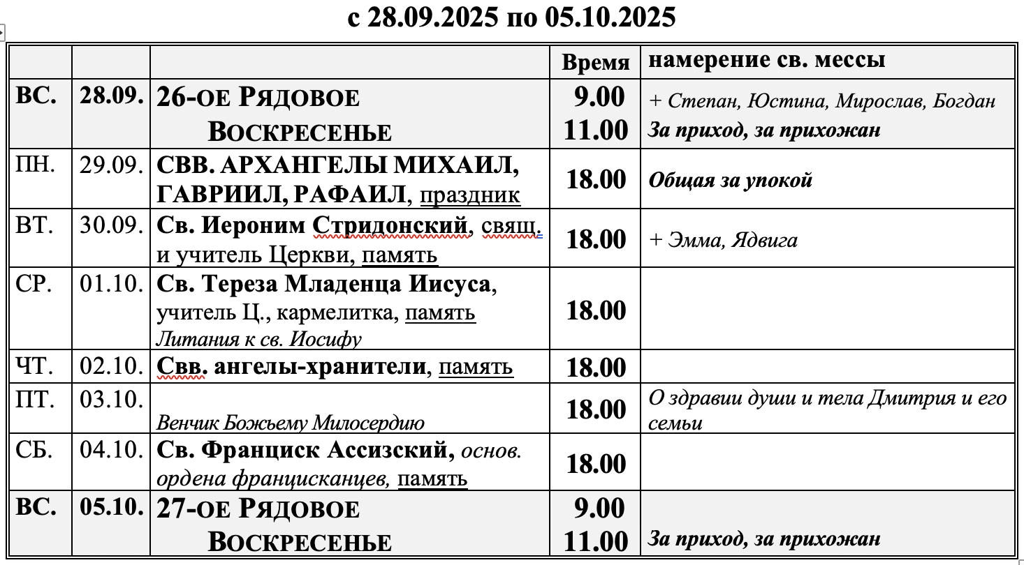 На этой неделе: 1 четверг– молитва о призваниях, 1 пятница и 1 воскресенье месяца (пожертвование на епархию).