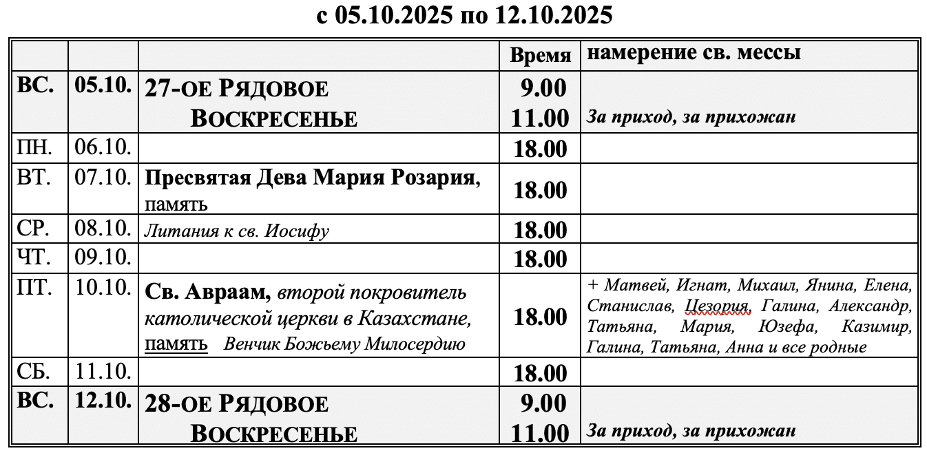 На этой неделе: 1 четверг – молитва о призваниях, 1 пятница – посещение больных и 1 воскресенье месяца (пожертвование на епархию).