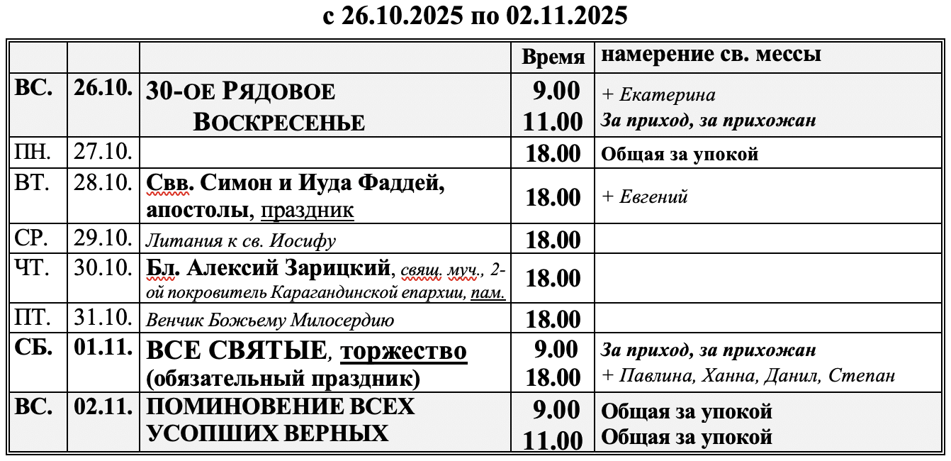 2. 25 октября, в субботу в 10.00 в Майкудуке в базилике Св. Иосифа будет святая месса, которую возглавит епископ Иосиф Верт. 26 октября, в воскресенье в 10.00 в храме Покрова Пресвятой Богородицы состоится архиерейская литургия, которую отслужит епископ Теодор Мацапула, епископ Мукачевский. (25-летие открытия миссии греко-католических сестер в Казахстане Служебниц Непорочной Девы Марии.)