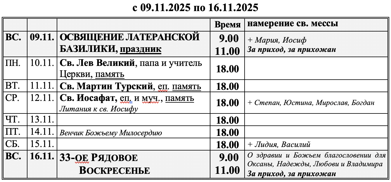 3. На этой неделе (с понедельника по четверг) в нашем центре реколлекциисвященников и сестер нашей епархии, поэтому время богослужений со вторника по четверг утром. Cв. мессы в базилике будут возглавлять отцы епископы нашей епархии. Во время утренних св. месс будем молиться утреннюю – литургию часов. Приглашаем вас на св. мессы и молитву.