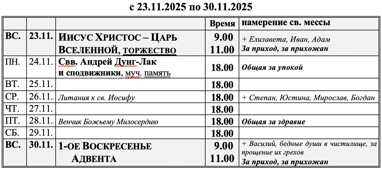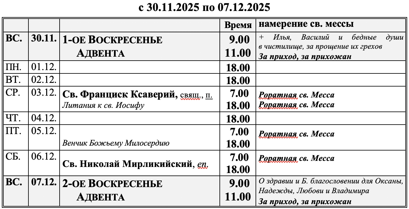 4. Со следующего воскресенья начинается время Адвента. В субботу вечером на святой мессе благословение адвентовских венков и в конце мессы в 11.00.