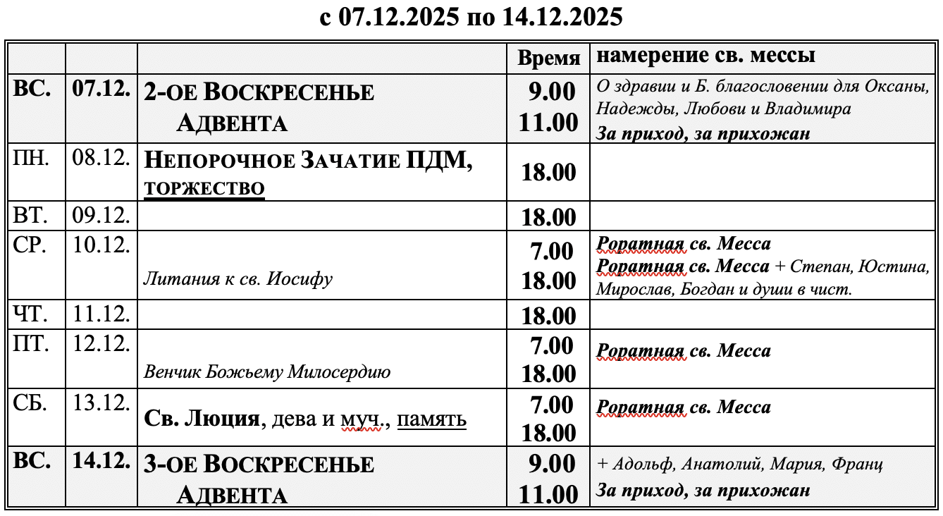 4. 31 декабря – окончание гражданского года, в 23.00 будет в храме адорация и в 24.00 св. месса с торжества Богородицы.